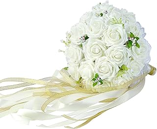 (A-white) - Wedding Bridal Bouquet, Febou Wedding Bride Bouquet, Wedding Holding Bouquet with Artificial Roses Lace Pearl Ribbon, Perfect for Wedding, Church, Party and Home Decor(Long Ribbon,White)